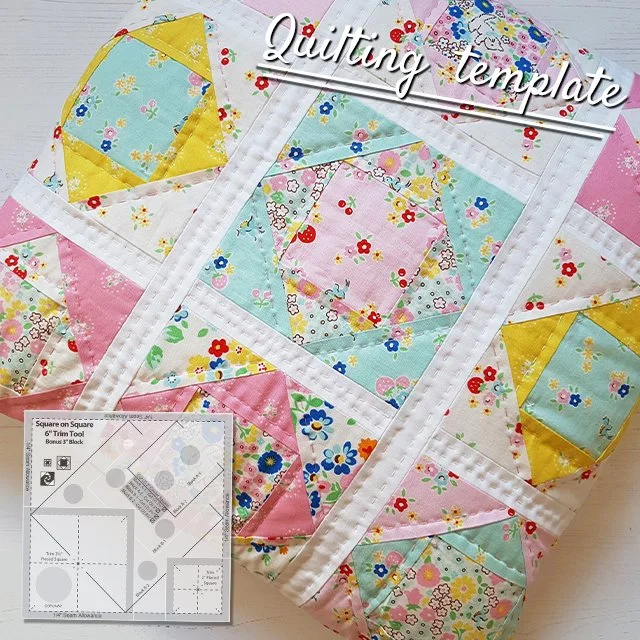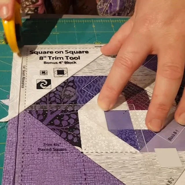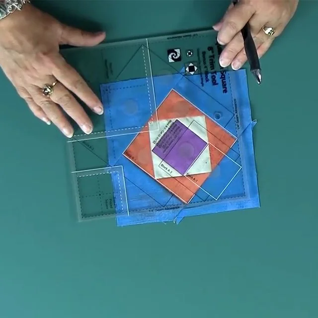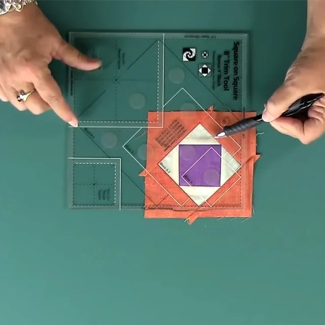 Create 3", 4", 6" or 8" square on square blocks. No calculation needed - all the cutting measurements are printed right on the tool! Trimming each round as triangles are added creates perfectly square, uniform blocks.