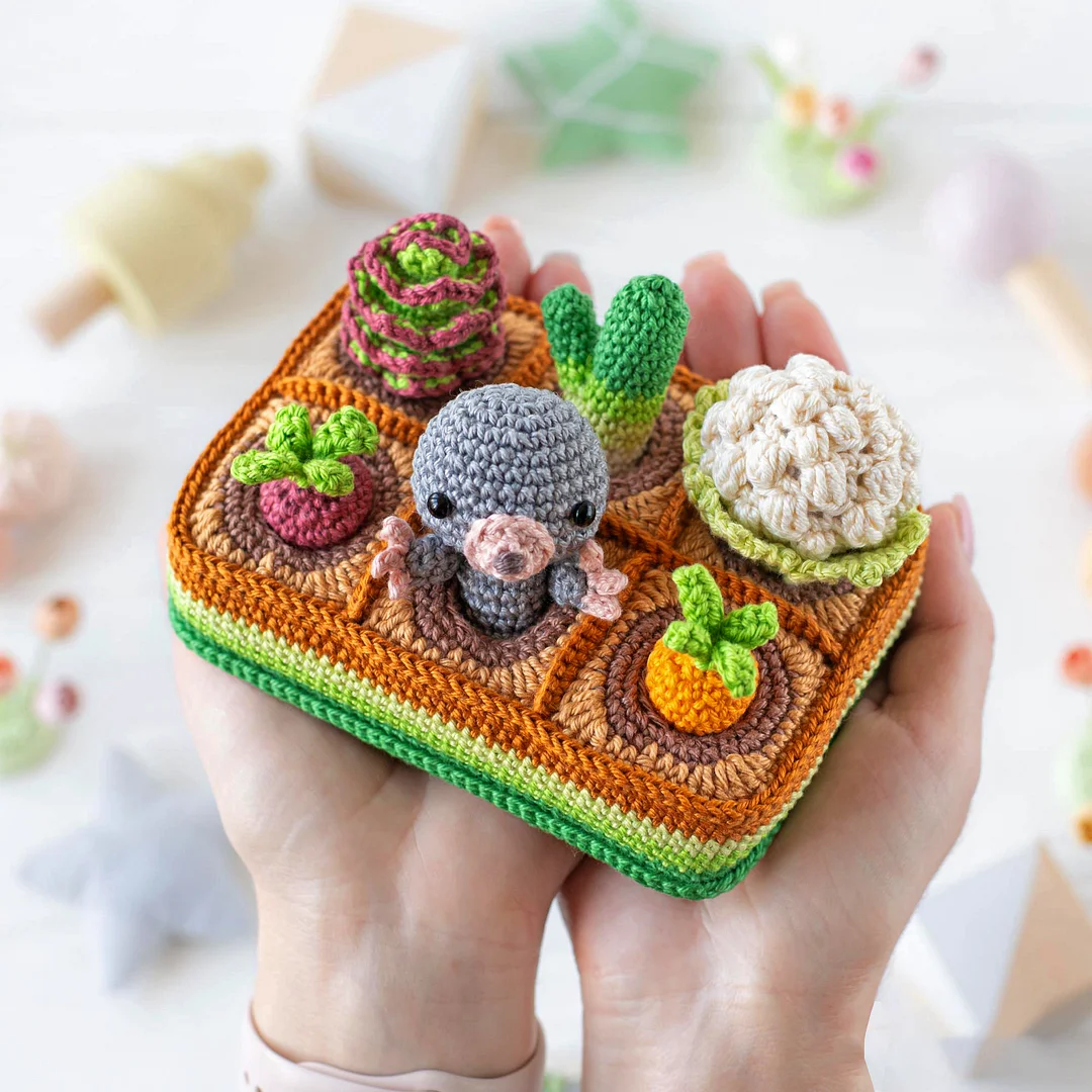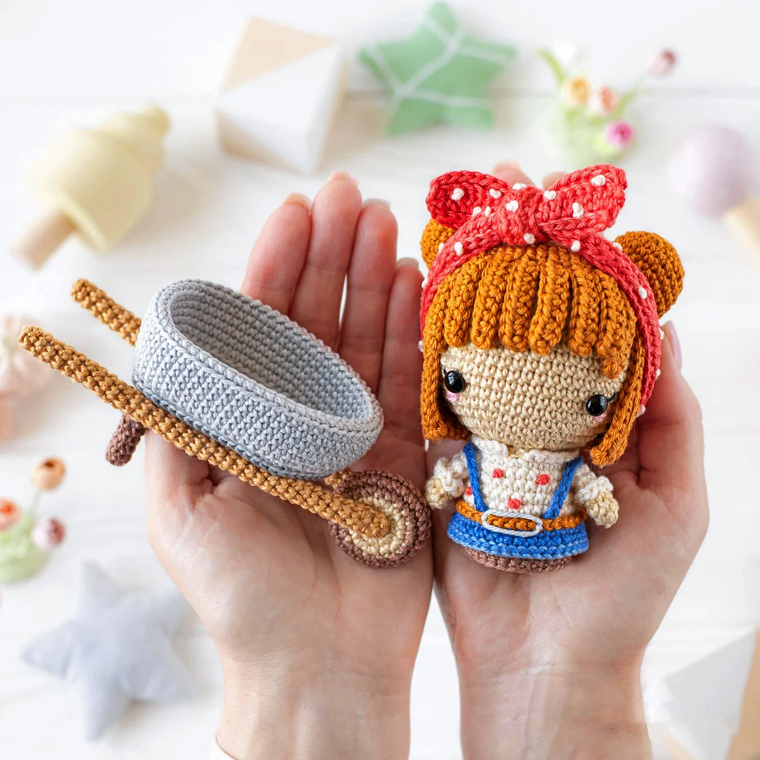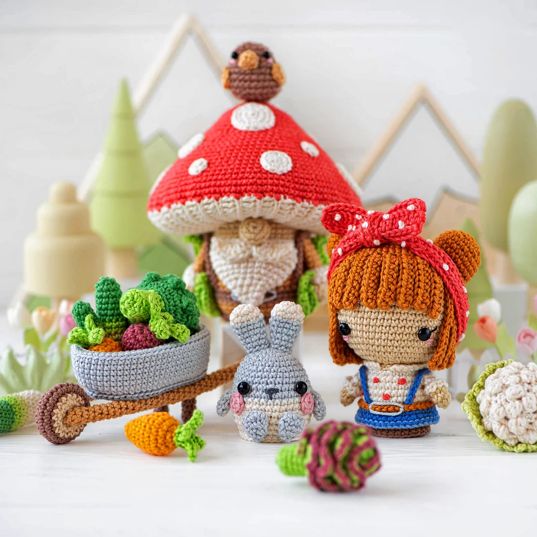🍄What Blooms in Your Basket →Garden Girl: Poseable arms hold her tiny watering can (yes, it tips!). →Veggie Patch: Carrotsactuallypull from the soil (mole included for drama). →Mushroom Gnome: Beard stitches double as a secret pocket. →Wheelbarrow: Functional enough to haul your coffee pods.