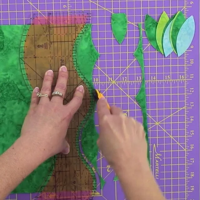 An applique template for rotary cutting. Available in three sizes to cut leaf shapes from 1 into 8in. were developed to eliminate the tedious steps of marking and cutting applique shapes with scissors.